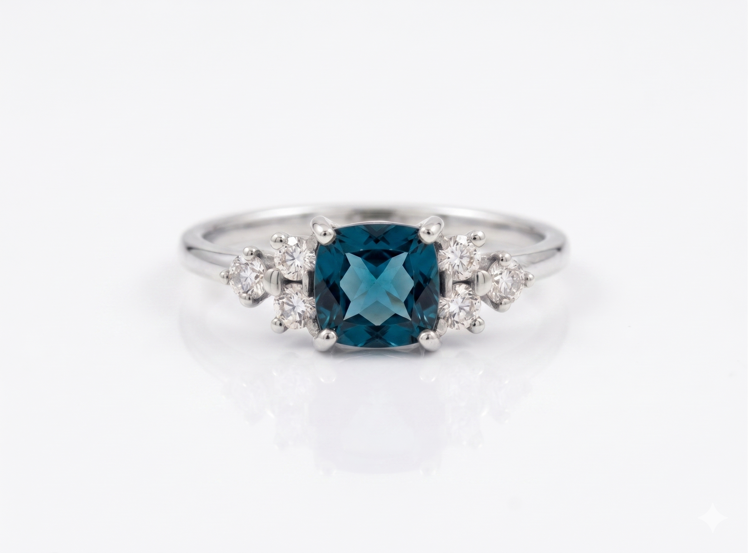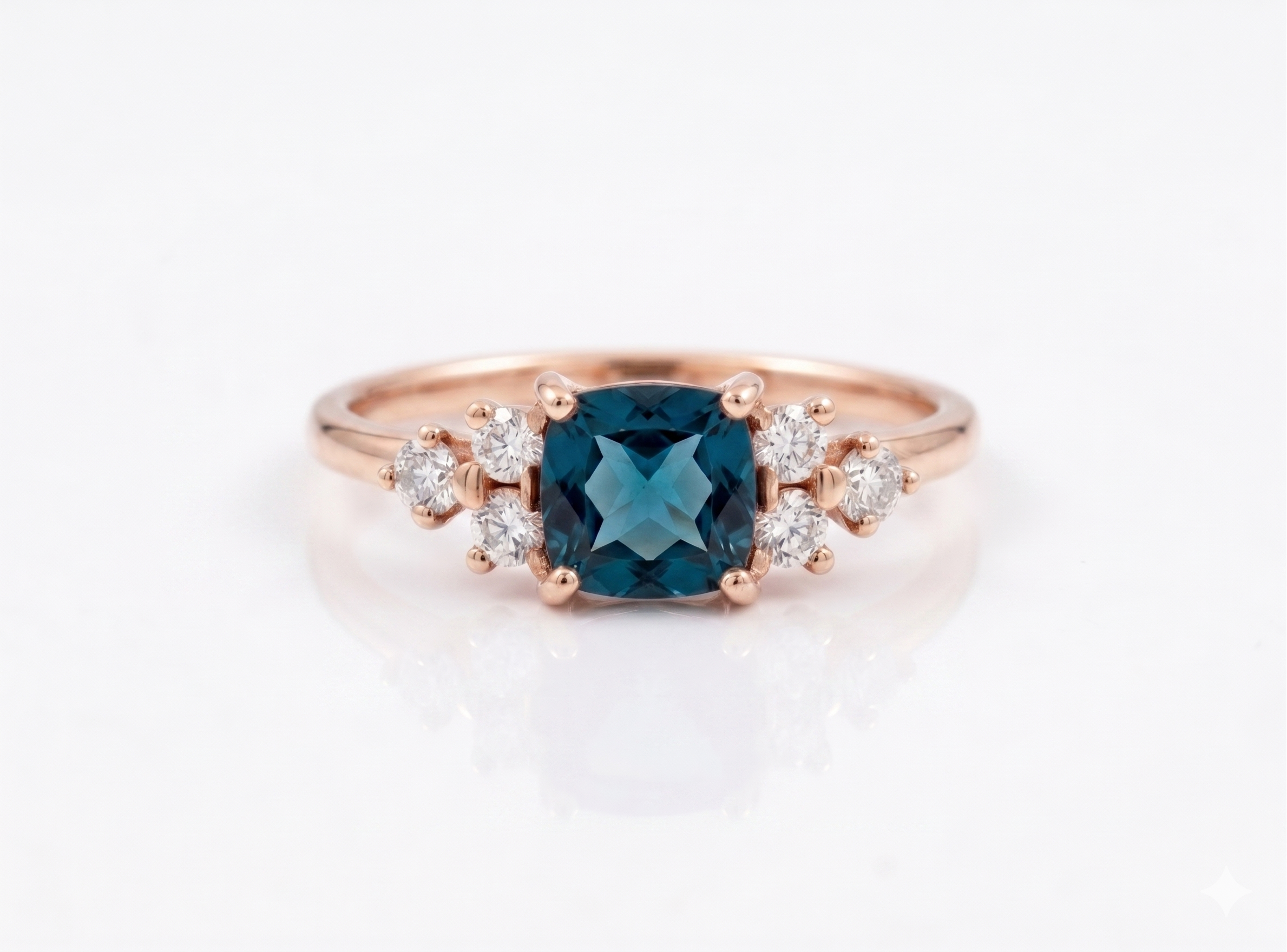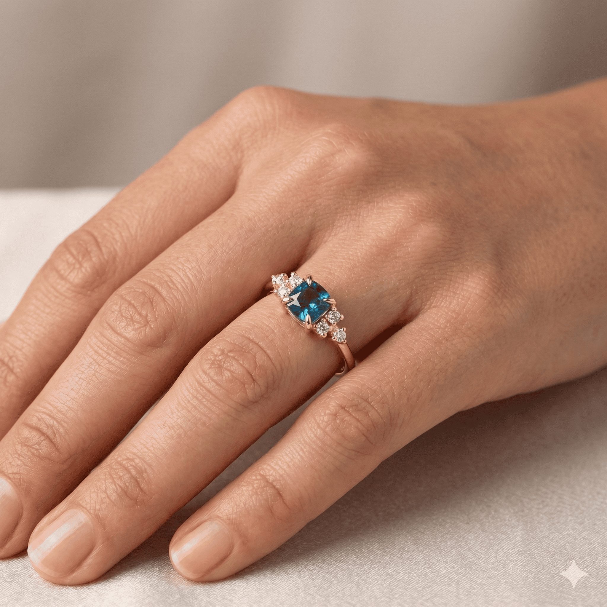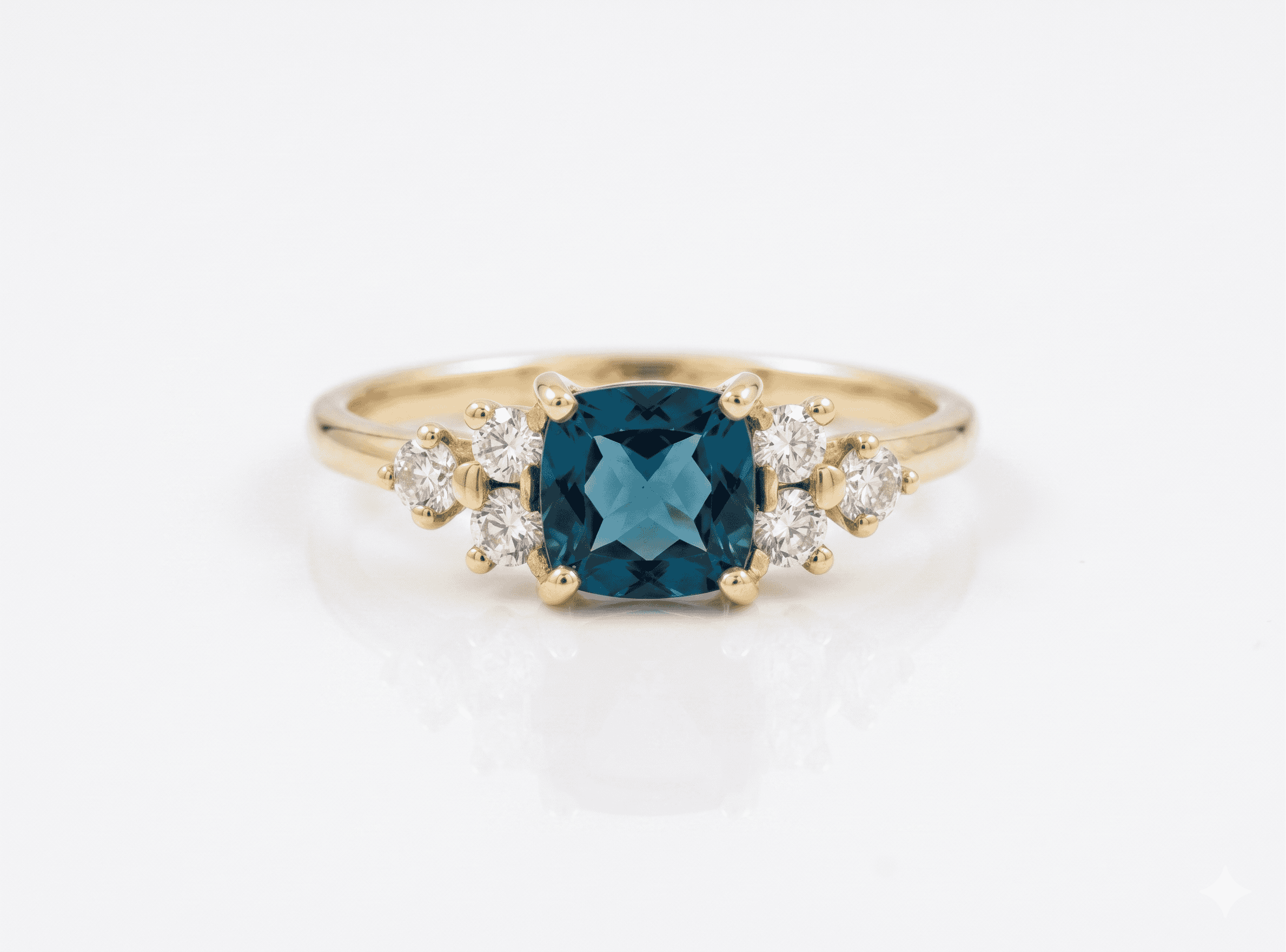 Unique Art Deco style ring, made from 14K recycled gold, Ethical Cushion-cut Blue Topaz Stone & six conflict-free white diamonds.
