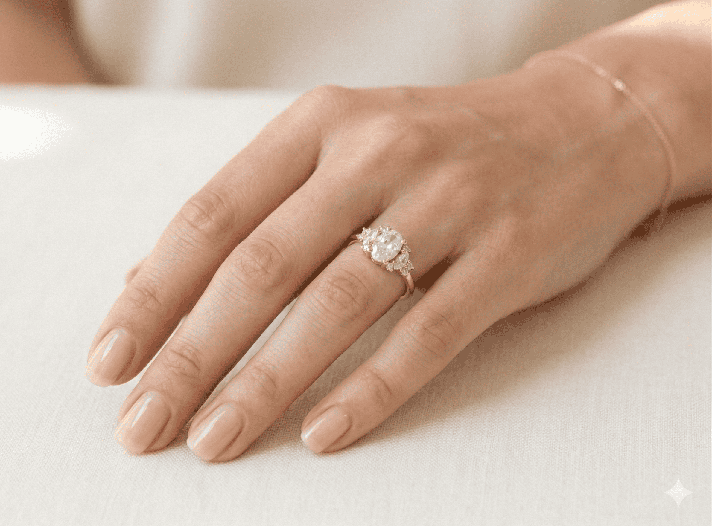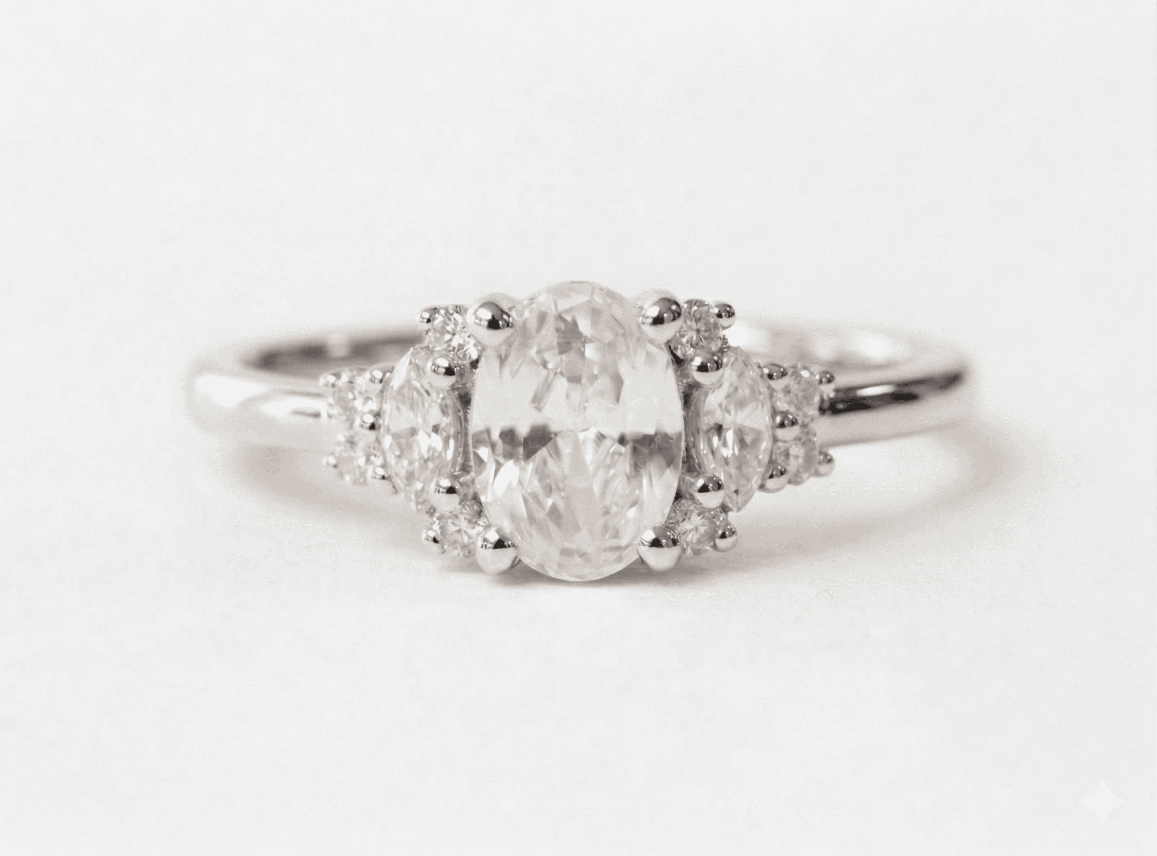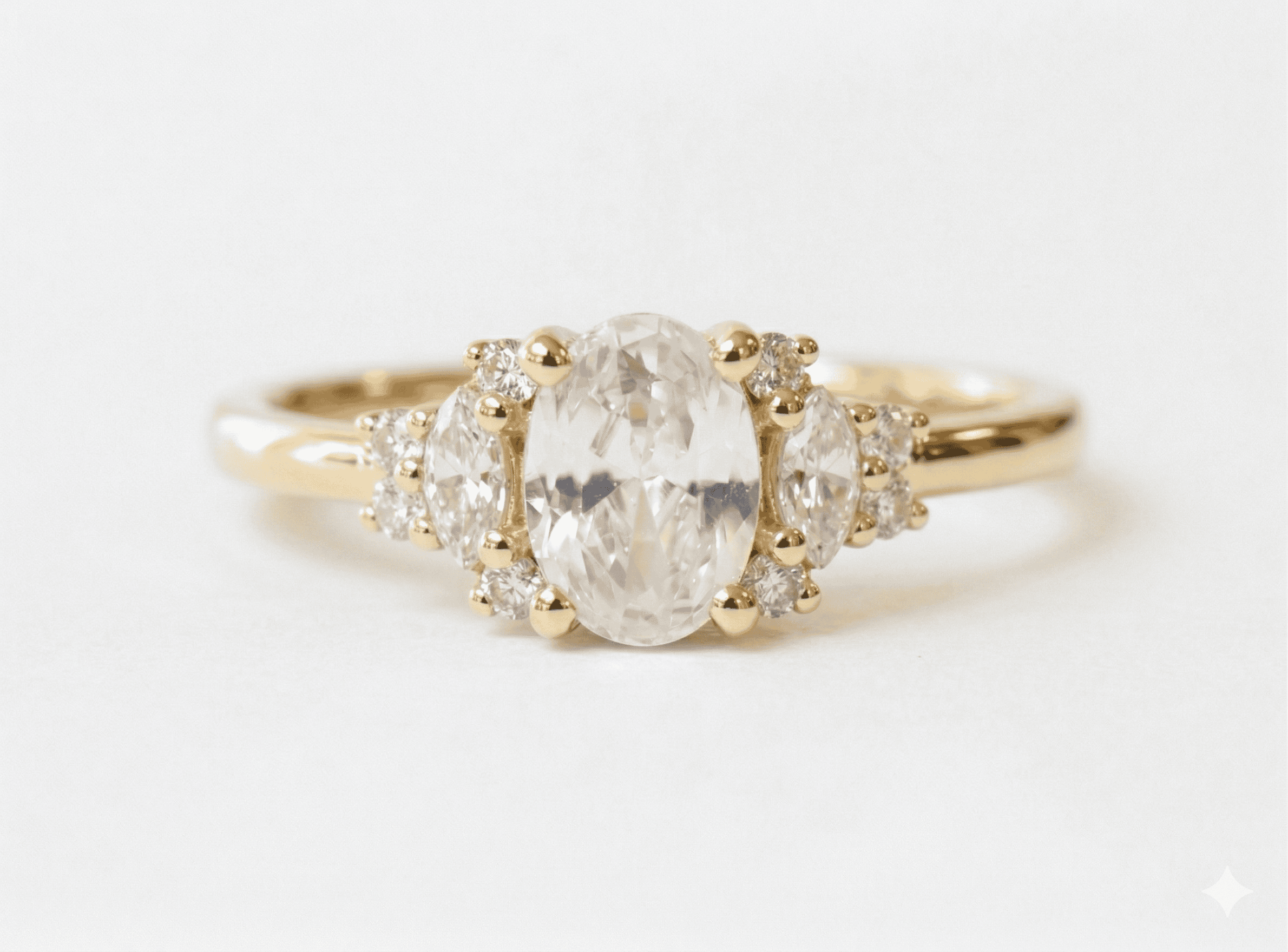 Handcrafted 14K gold ring with a clear oval gemstone at the center and sparkling diamond accents on each side. A timeless and delicate ring with a soft romantic feel.