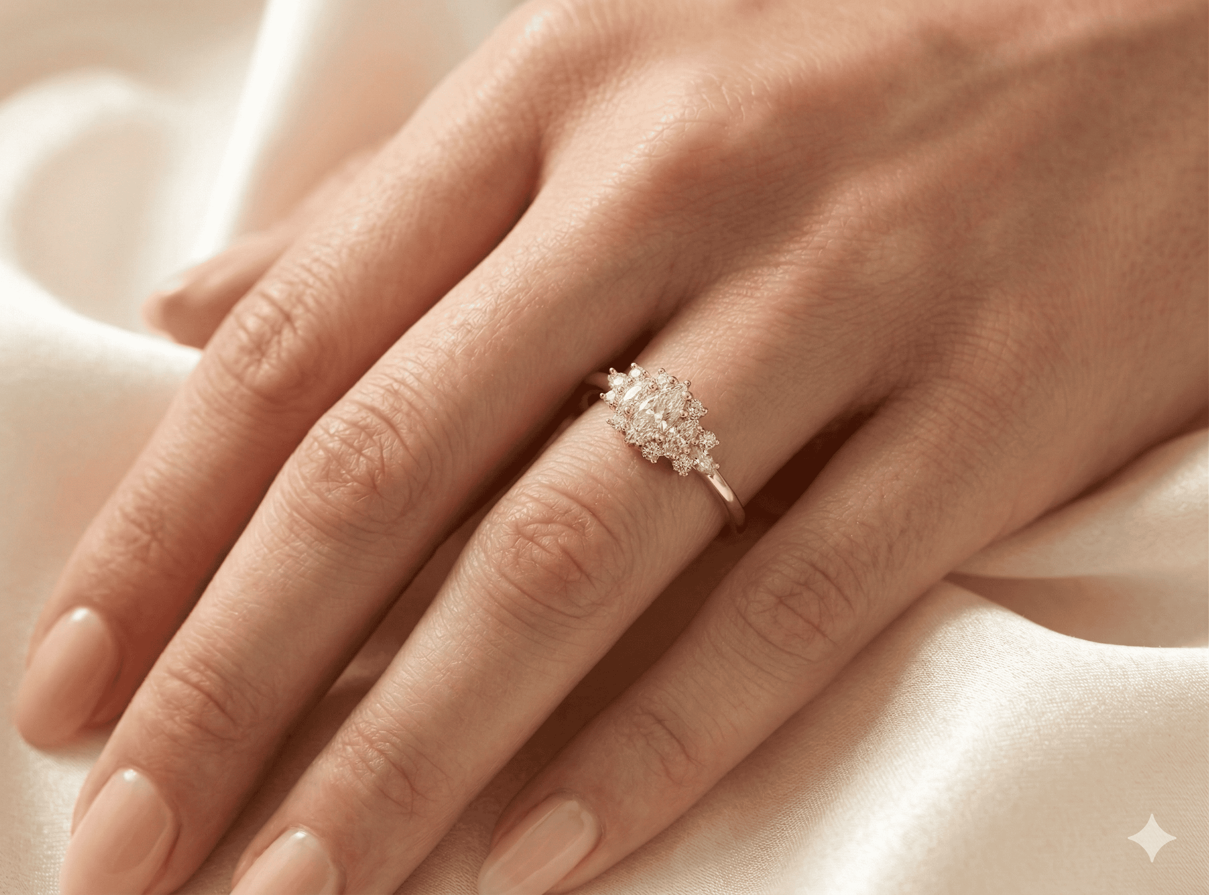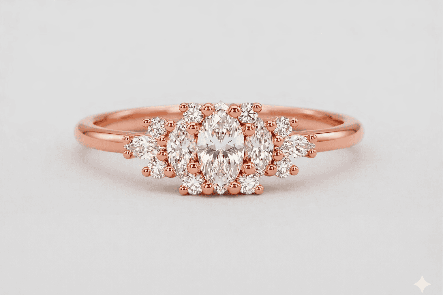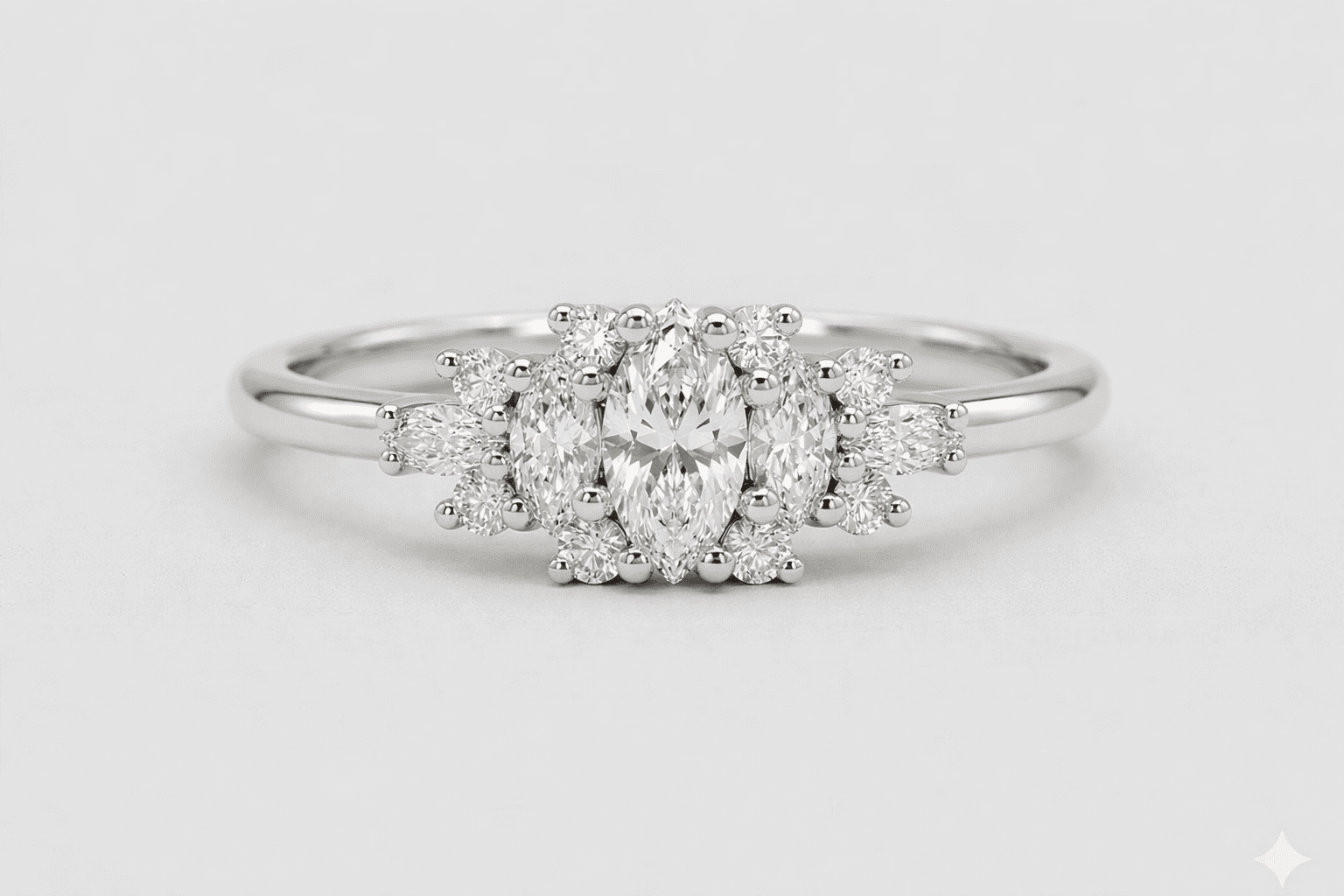 טבעת זהב בעבודת יד עם שלושה יהלומים בחיתוך מרקיזה במרכז, מוקפים ביהלומים קטנים ליצירת מראה פרחוני וזוהר במיוחד. שילוב מרהיב של נוכחות, ברק ואלגנטיות נצחית.