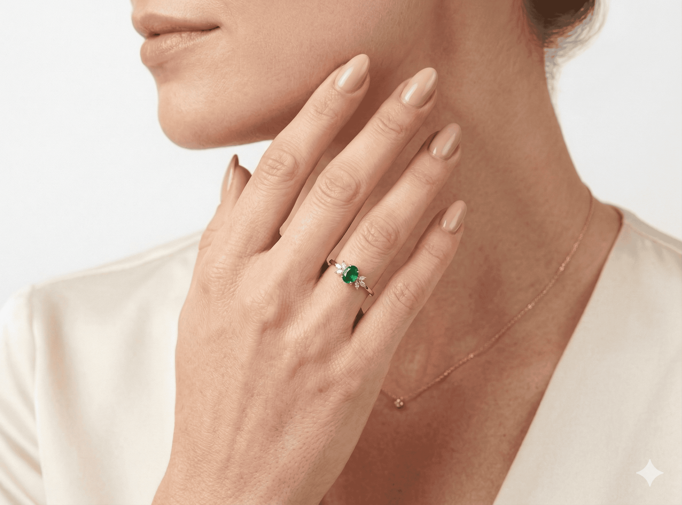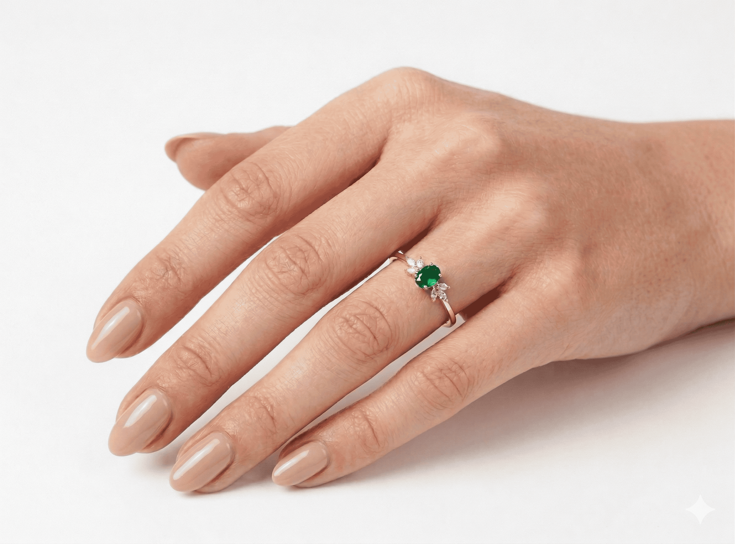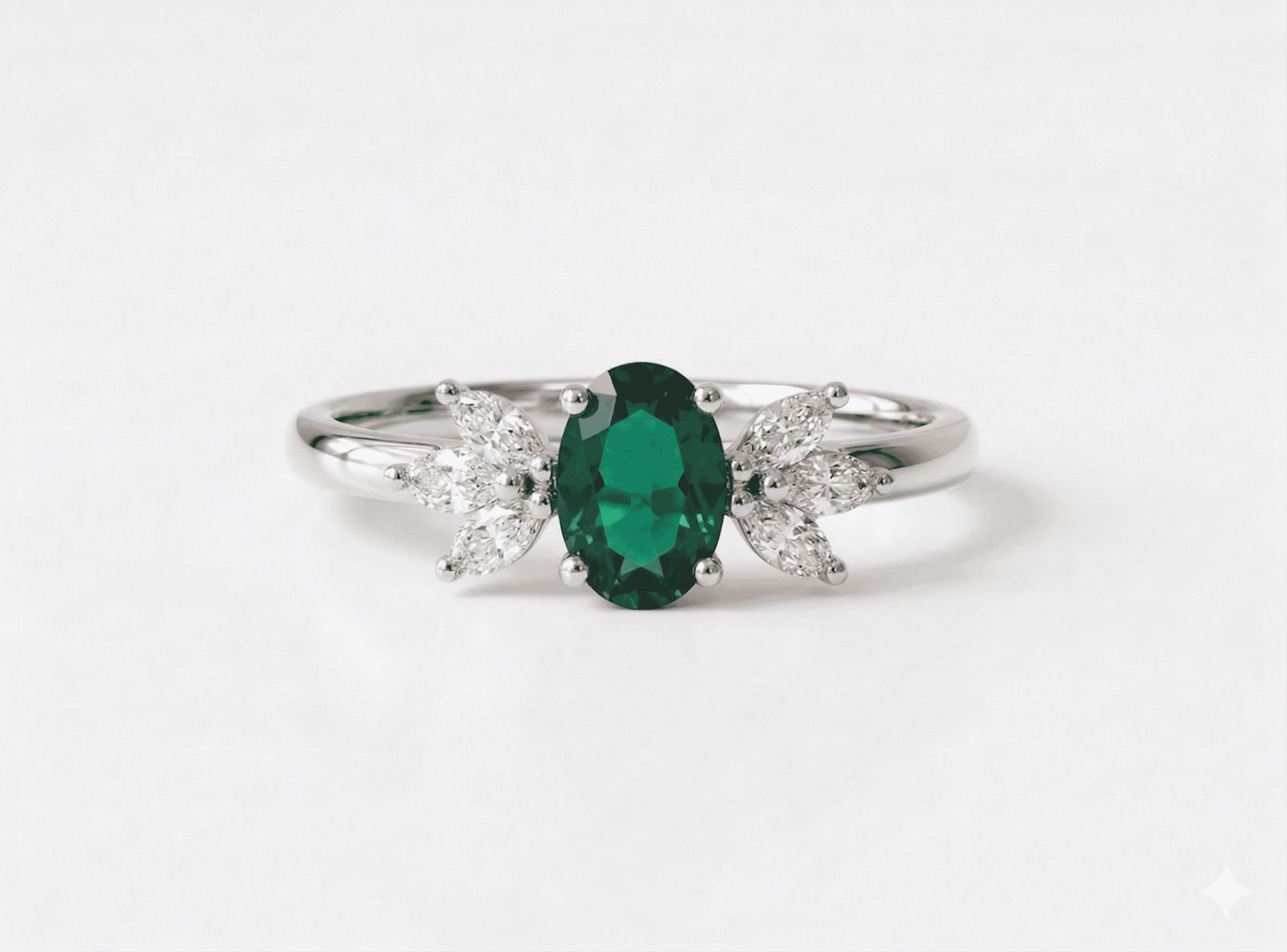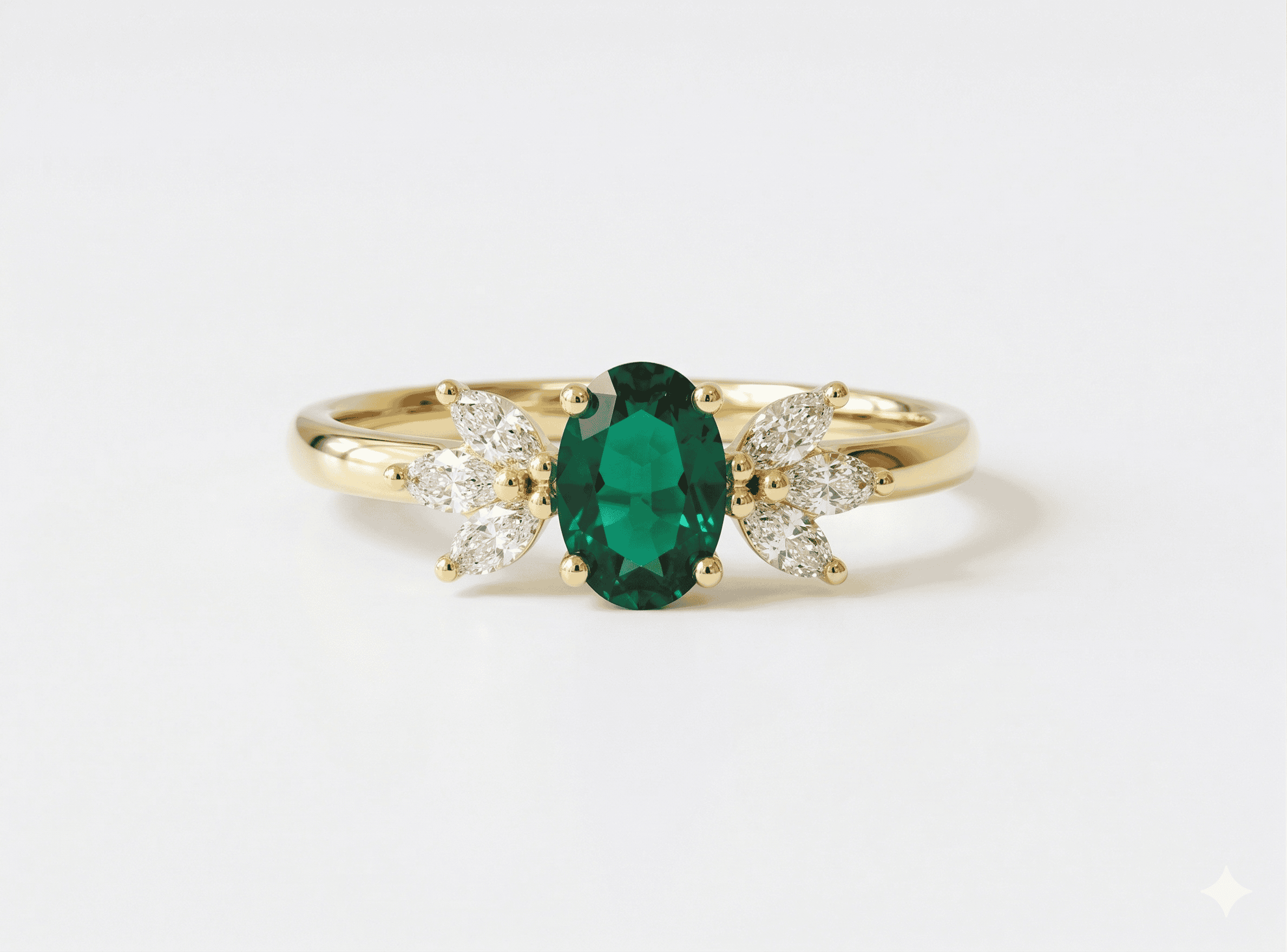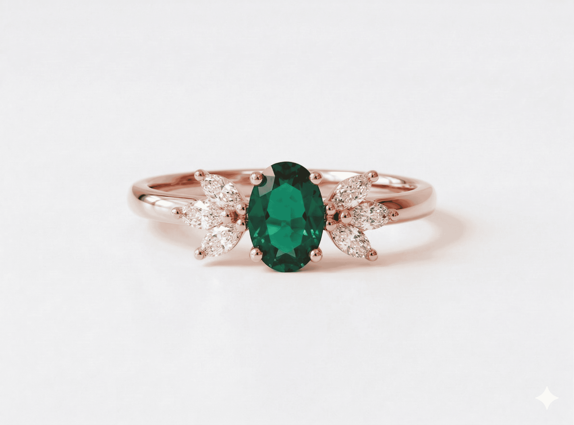 טבעת זהב 14K עם אבן אמרלד מעבדה אובלית במרכז ושישה יהלומי מעבדה מרקיזה נוצצים בצדדים, בעיצוב שמזכיר עלים ופרחים. שילוב מרהיב של צבע, ברק ודיוק – טבעת עם נוכחות רכה ומרשימה.