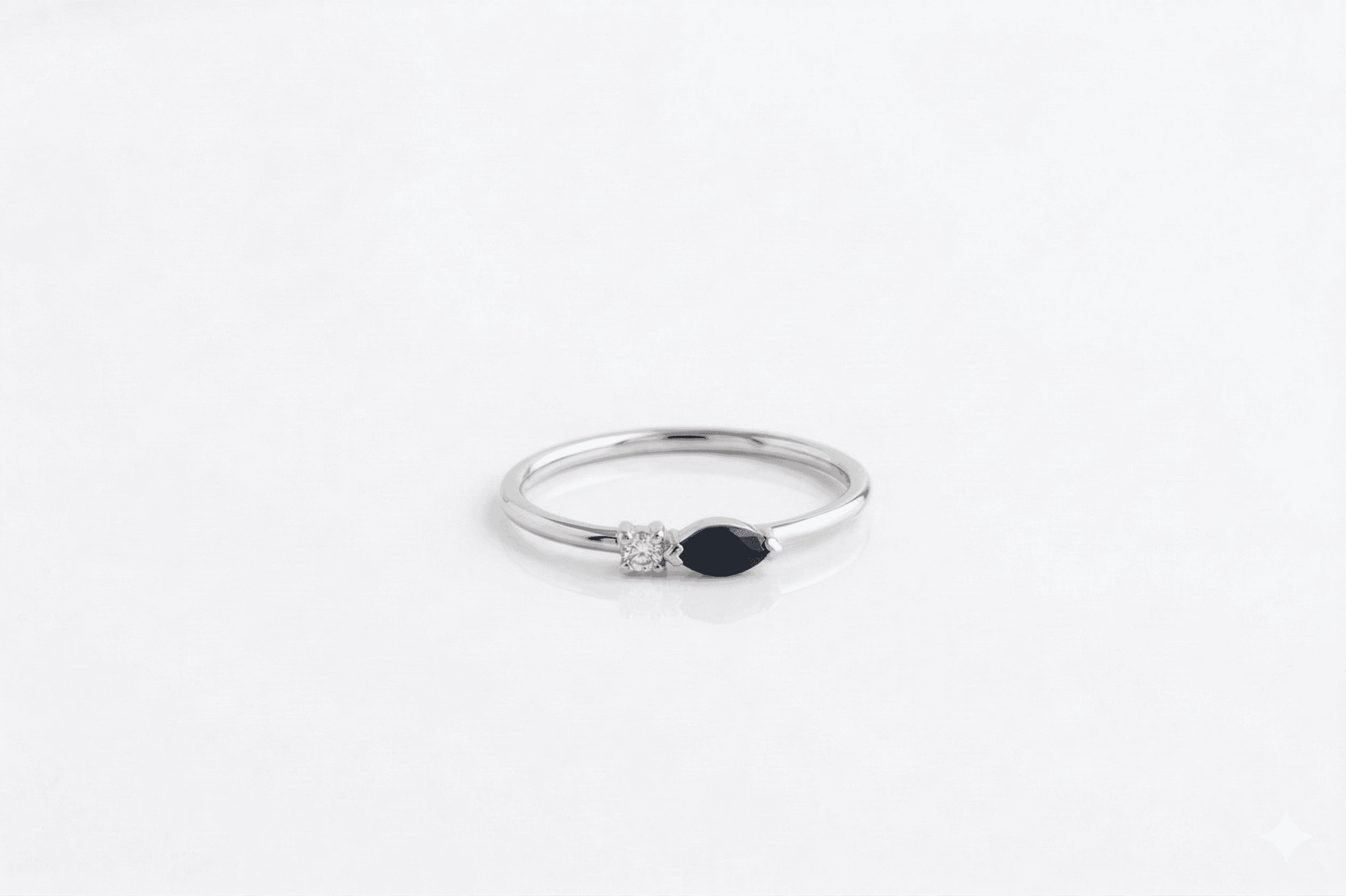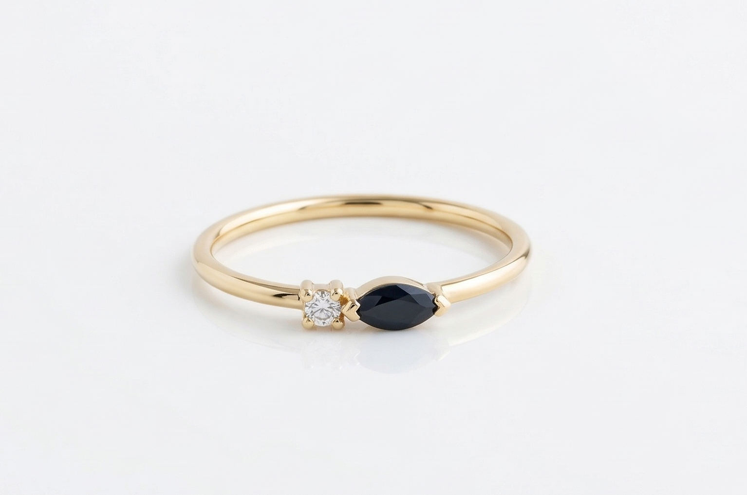 טבעת זהב עם אבן חן ספיר כחולה כהה בחיתוך מרקיזה ויהלום מעבדה לבן, הטבעת מתאימה גם כטבעת אירוסין למי שמחפשת משהו מאוד מאוד עדין וסולידי.