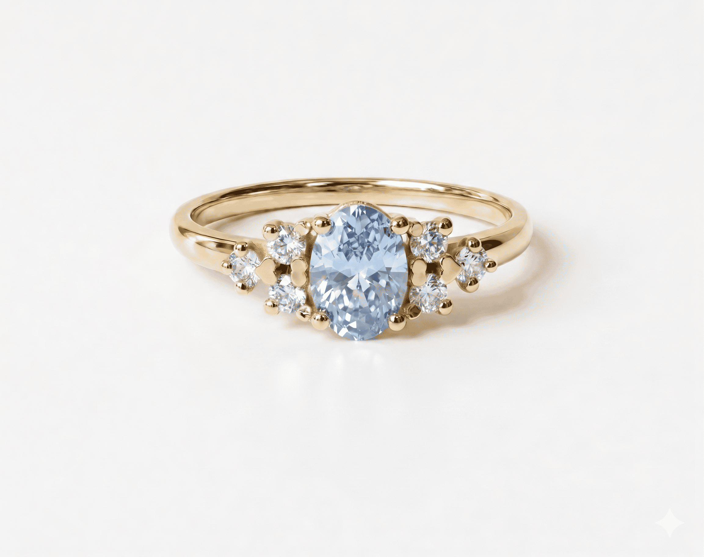 טבעת אירוסין עם קריצה מודרנית, משובצת אבן חן סקיי טופז כחולה בהירה בחיתוך אובלי ושלושה יהלומי מעבדה קטנים בכל צד. טבעת עם המון נוכחות, קסם ובעיקר ידידותית לסביבה.