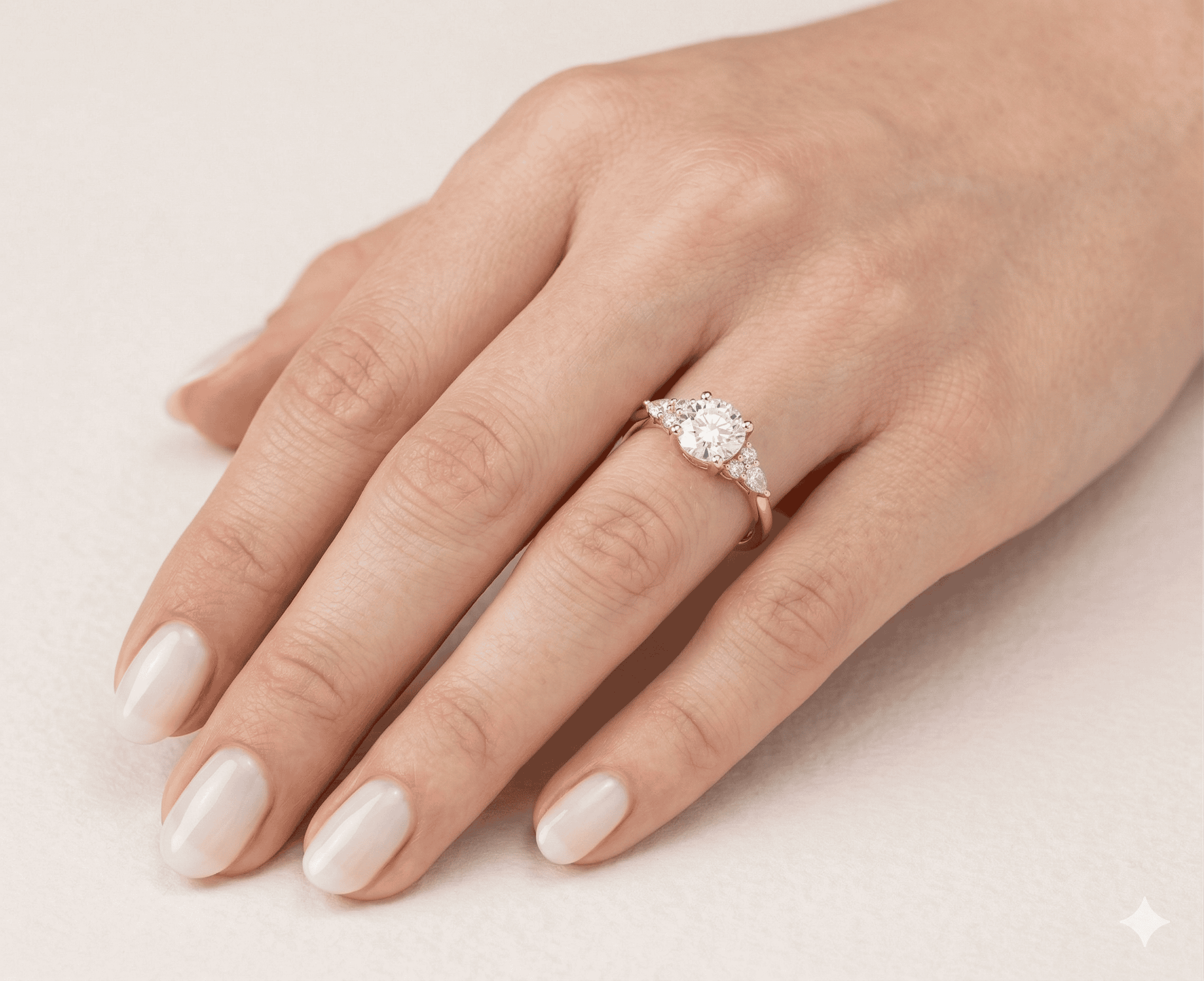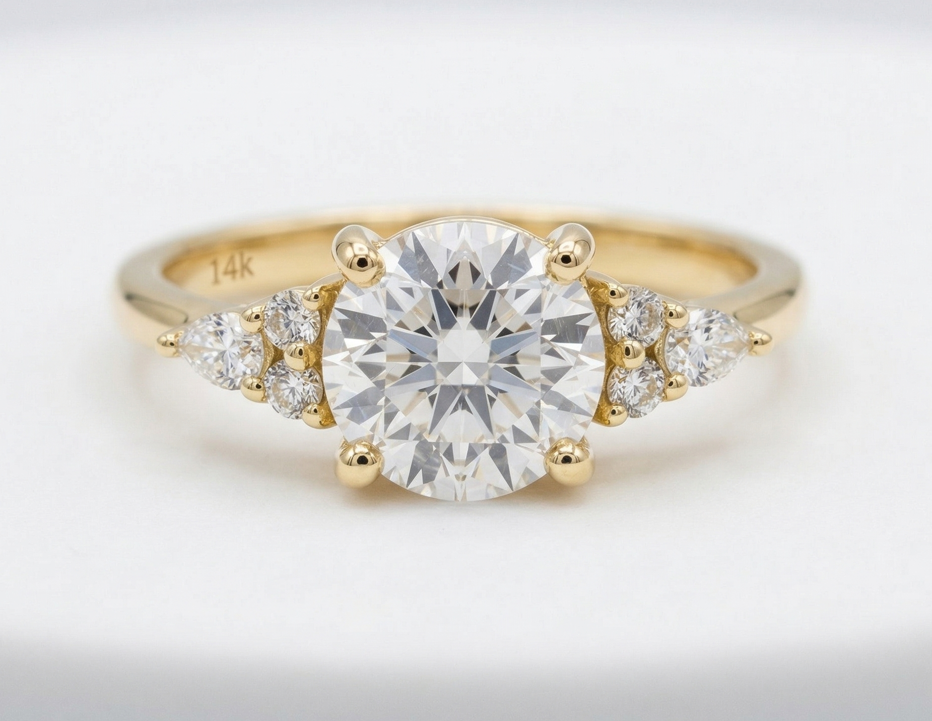פרופיל הטבעת עגול בעובי 1.5 ממ | יהלומי מעבדה: יהלום מרכזי עגול במשקל 1 CT מתועד | יהלומי צד עגולים 1.4 מ”מ | יהלומי טיפה 2*3 מ”מ | צבע D-G | ניקיון VS.