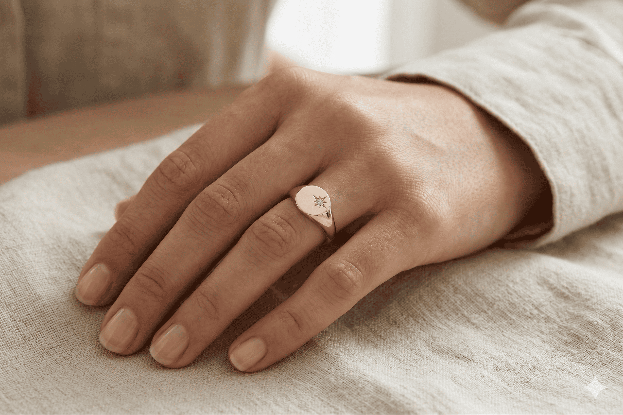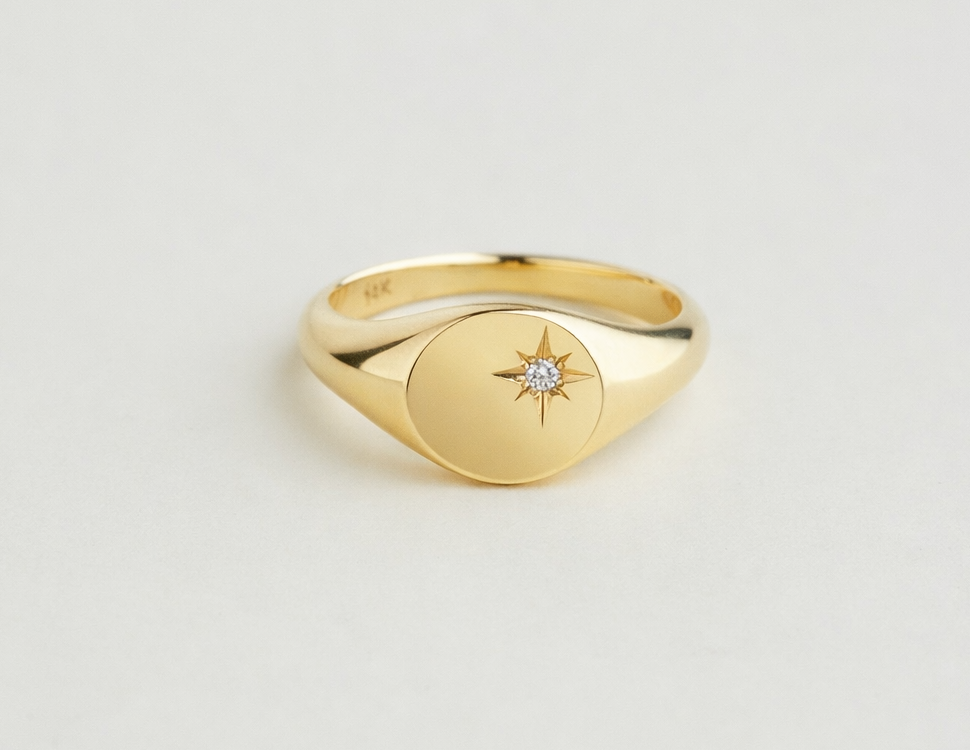 טבעת זהב חותם עגול קלאסית בתוספת יהלום עדין עם עיטור כוכב מסביבו.