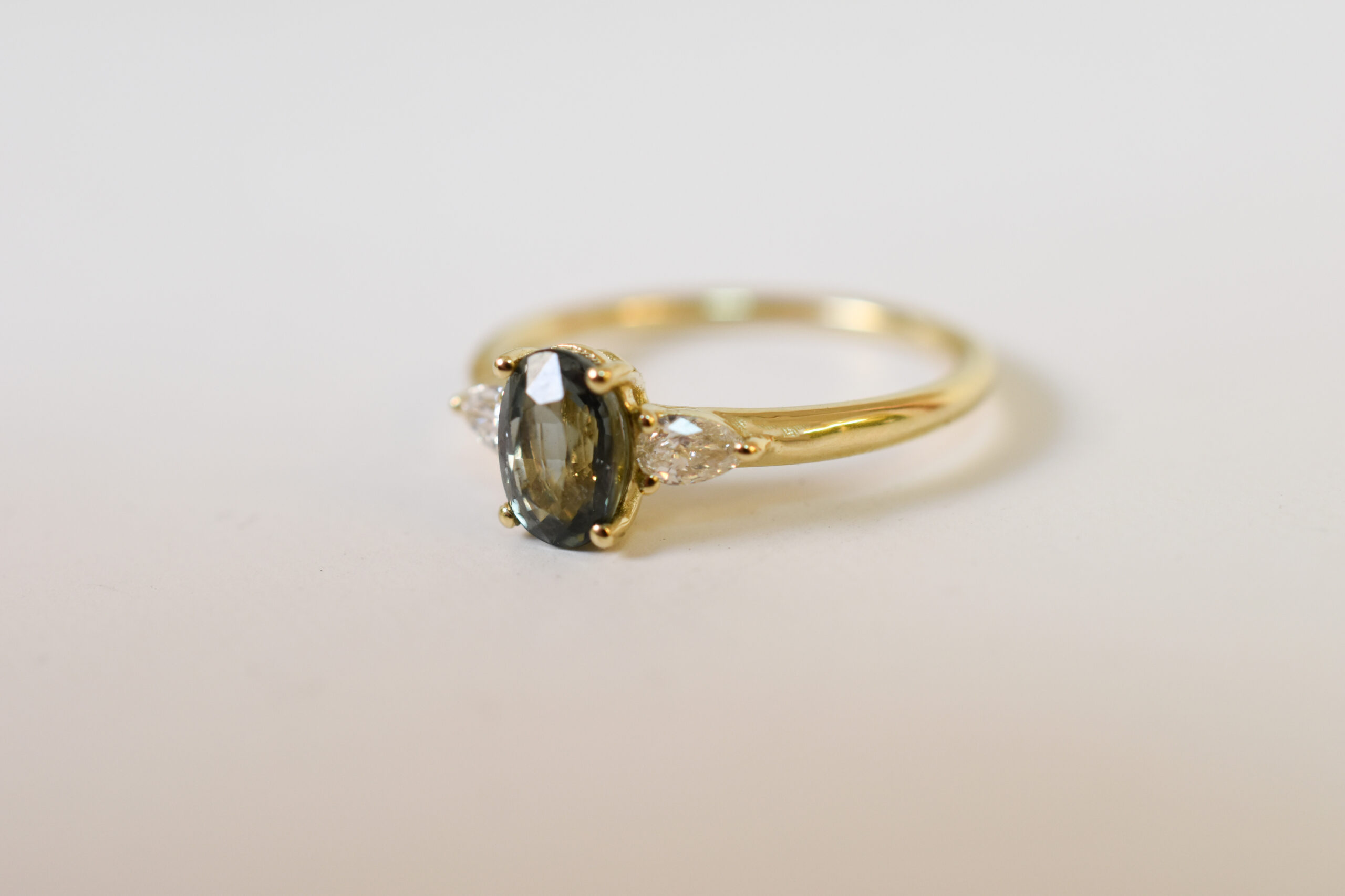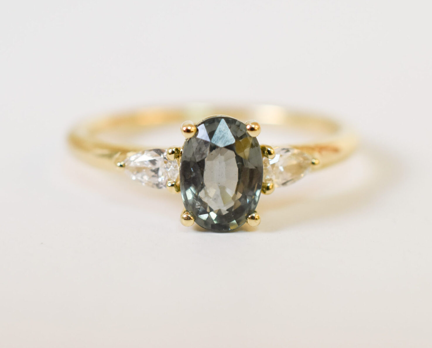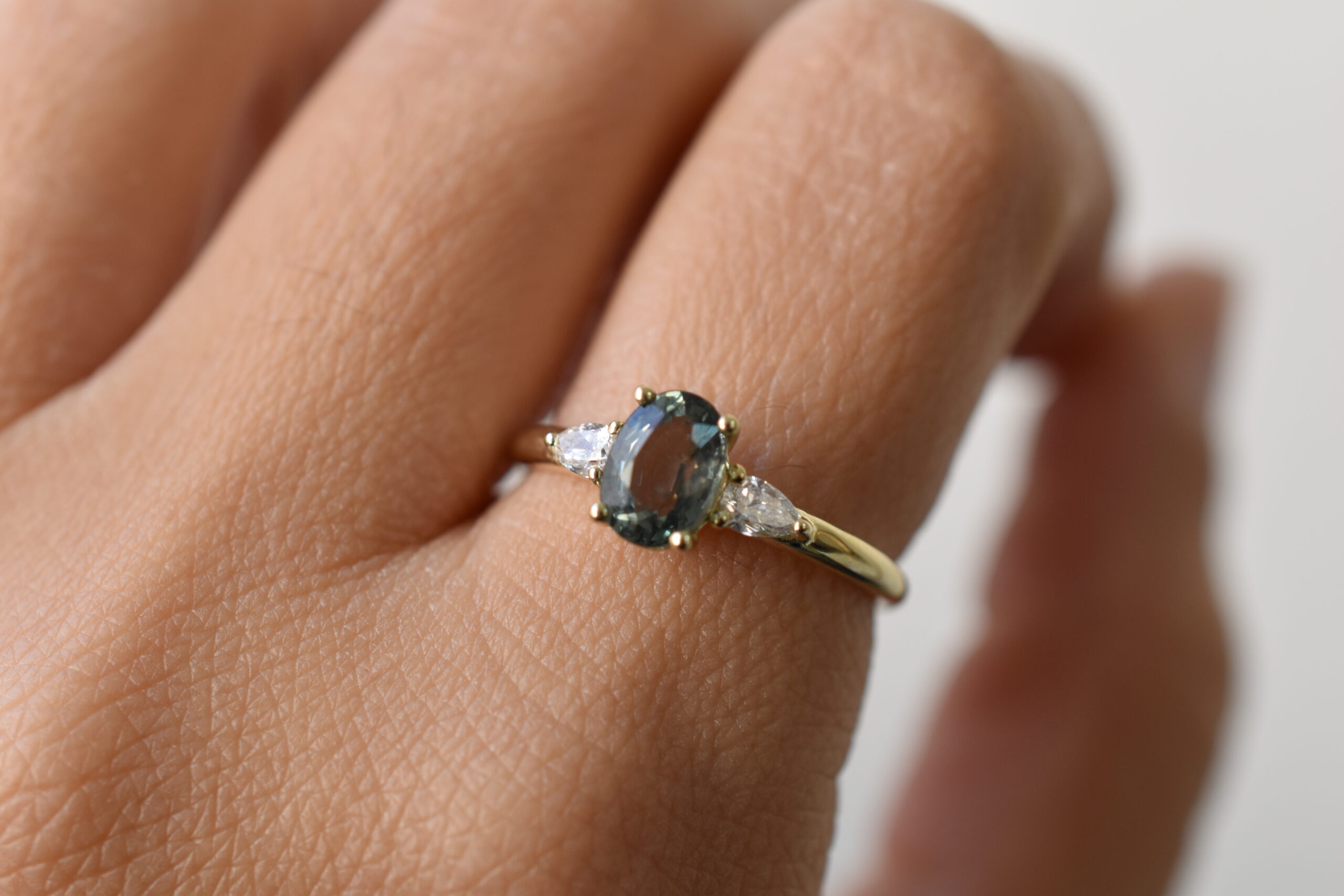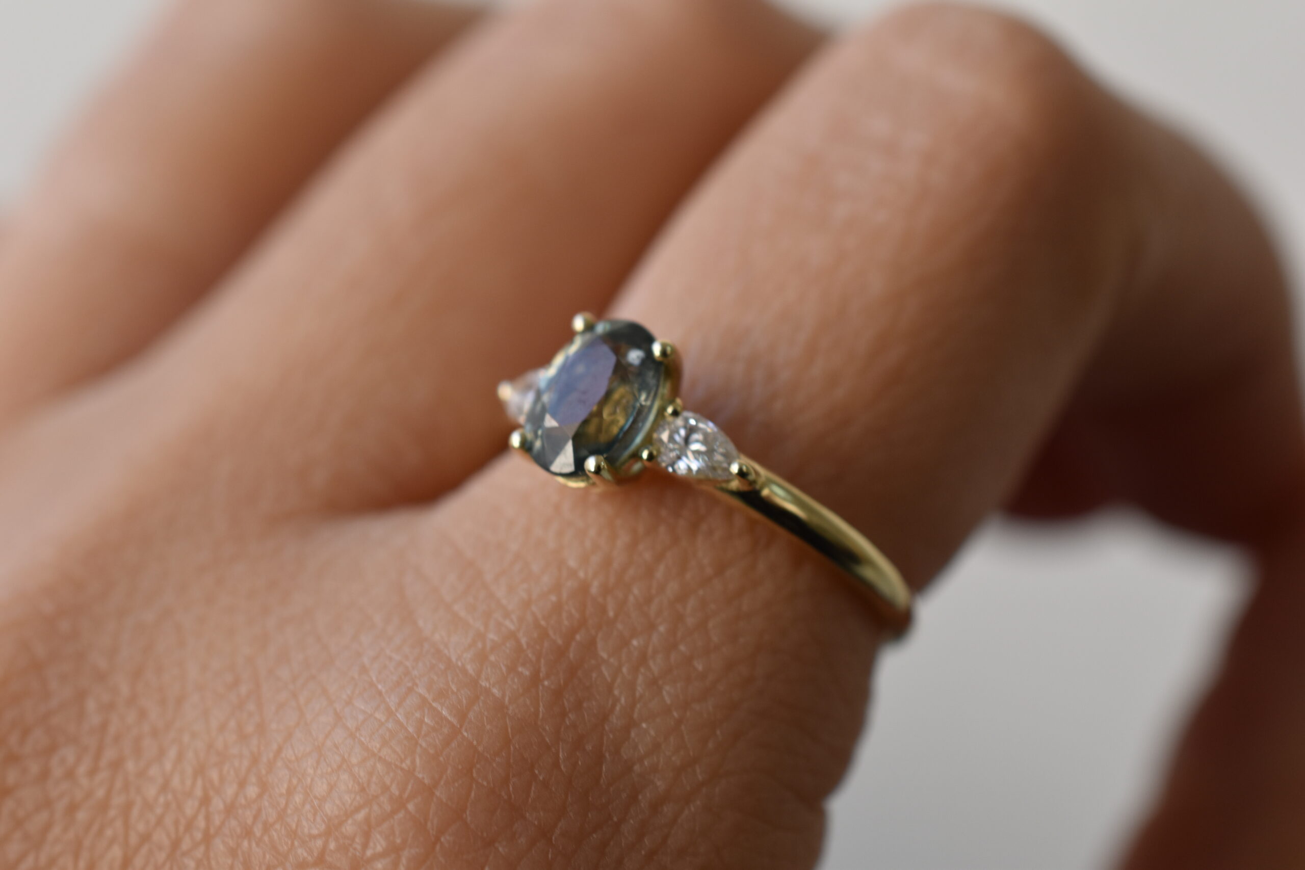 עשויה מזהב ממוחזר, ספיר אתית ויהלומי מעבדה — שילוב של יופי, מודעות ואומנות מדויקת.